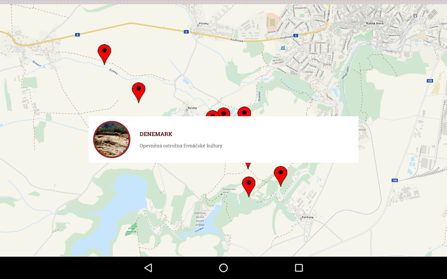 Aplikace obsahuje celkem 9 zastávek rozmístěných po širším okolí Bylan tak, aby byly zachyceny hlavní objekty a části osídlení tehdejší neolitické krajiny. Návštěvník má možnost se prostřednictvím aplikace samostatně orientovat, kdy je mu k dispozici mapa s vyznačením jednotlivých zastávek včetně jeho aktuální polohy a získávat o jednotlivých point of interest základní textové a obrazové informace.